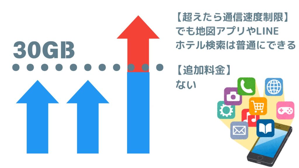 ✅海外で30GBを超えたらどうなる?【結論:通信制限のみ】