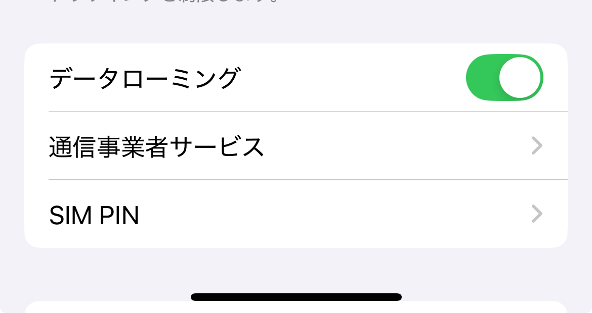 ※データローミング:海外で日本の通信システムを使う機能。だいたい最初はOFFになってる。