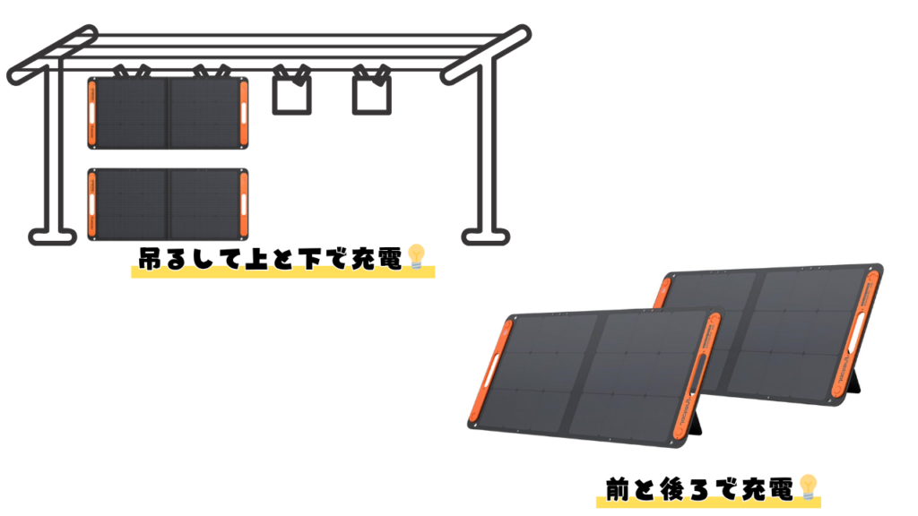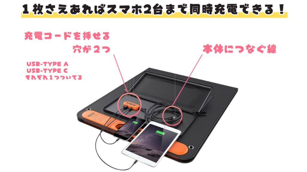 それぞれに直接充電ケーブルを差し込めるのでSolarSaga 100W1枚あたり同時に2つのスマホやタブレットを充電できちゃいます。