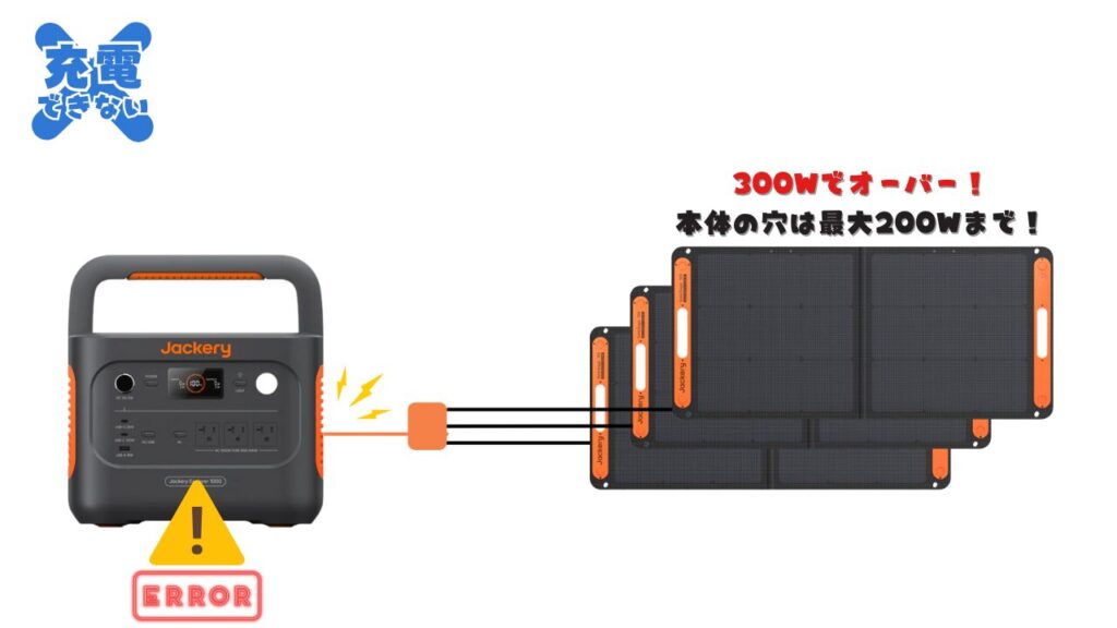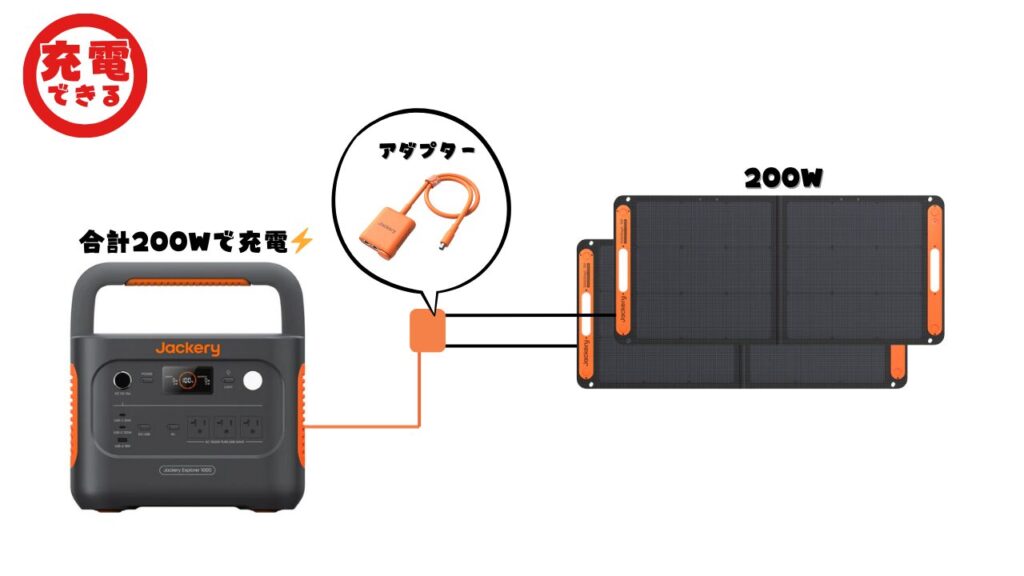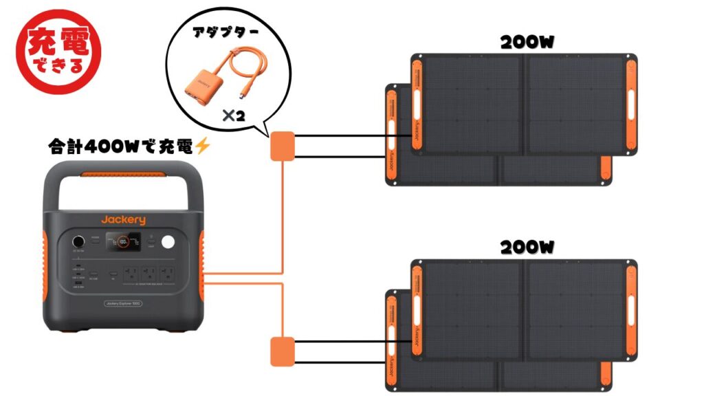 2つの差し込み口にアダプターを使って200Wずつ、合計400Wでパネルを使う(OK)