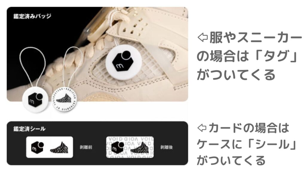スニーカーや衣服、そのほかブランド品(財布や時計)の場合は「鑑定タグ」が取り付けられます⇩
