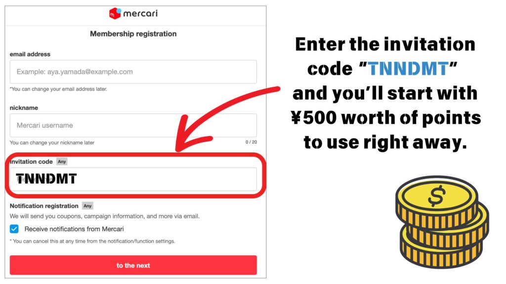 On the sign-up page, copy and paste “TNNDMT” into the “Invitation Code” field. This way, you’ll start Mercari with ¥500 worth of points ready to use.