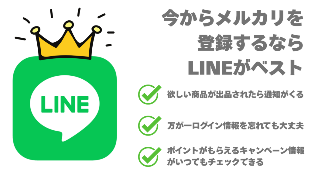 LINEで登録しておくと「欲しい商品が出品されたら通知がすぐに届く」「ログイン情報を忘れてもログインできる」「ポイントがもらえるキャンペーン情報がチェックしやすい」とメリットが多くあります。
