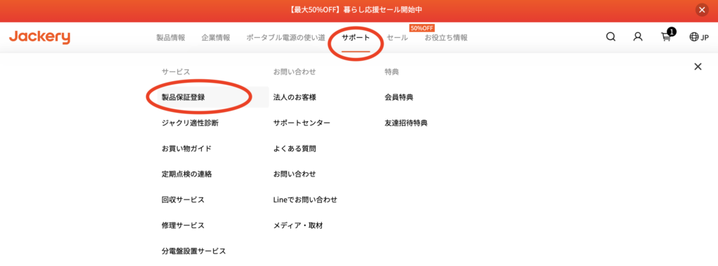 Amazonで買ったとしてもJackery公式ページで製品登録を行うと、