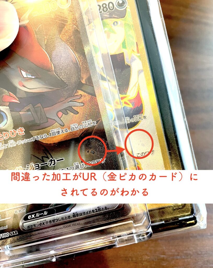 今回「NのゾロアークUR(ウルトラレア)エラー品(表面ホロ加工が本来とは別のレアリティSAR(スペシャルアートレア)加工をされたエラー品)」なので、エラー品ではない「NのゾロアークUR」と「NのゾロアークSAR」を使って比較。